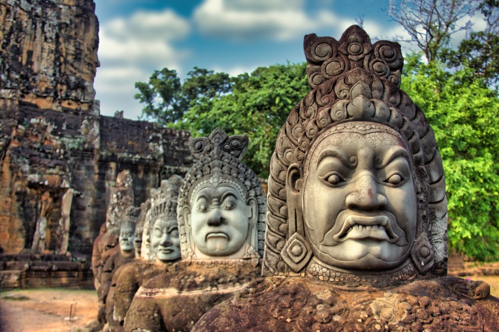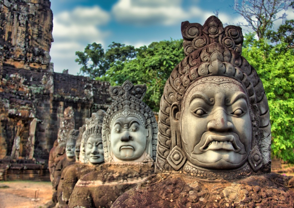 Ангкор Тхом — древняя столица Кхмерской империи, построенная в конце XII века. Это огромный укреплённый город с воротами, украшенными каменными лицами и мифическими существами. Главный храм города — Байон — знаменит десятками гигантских каменных лиц, высеченных на башнях. Считается, что эти лица символизируют бодхисаттву сострадания или самого короля Джаявармана VII.