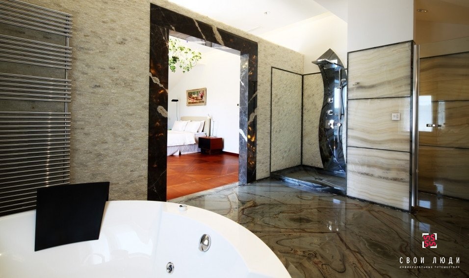 - Главная спальная комната (3 этаж) – двухместная спальня с ванной комнатой с ванной и джакузи (71 м²), гардеробная, просторный балкон с видом на море.
