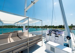 Владельцы Vela также являются творческой силой Nirjhara, роскошного курорта в Танах-Лоте, Бали. На борту яхты вы можете ожидать того же эко-шика в дизайне. Богатое тиковое дерево прекрасно контрастирует с белой и кремовой обивкой и подушками. Огромные окна пропускают естественный свет в элегантную столовую и лаундж, где есть бар и винный погреб. На обширных деревянных палубах есть места для обедов на свежем воздухе, а также большие диваны и шезлонги для принятия солнечных ванн и наблюдения за горизонтом. Есть также палуба для йоги, где вы можете выполнять солнечные приветствия или медитировать под дуновением морского бриза.