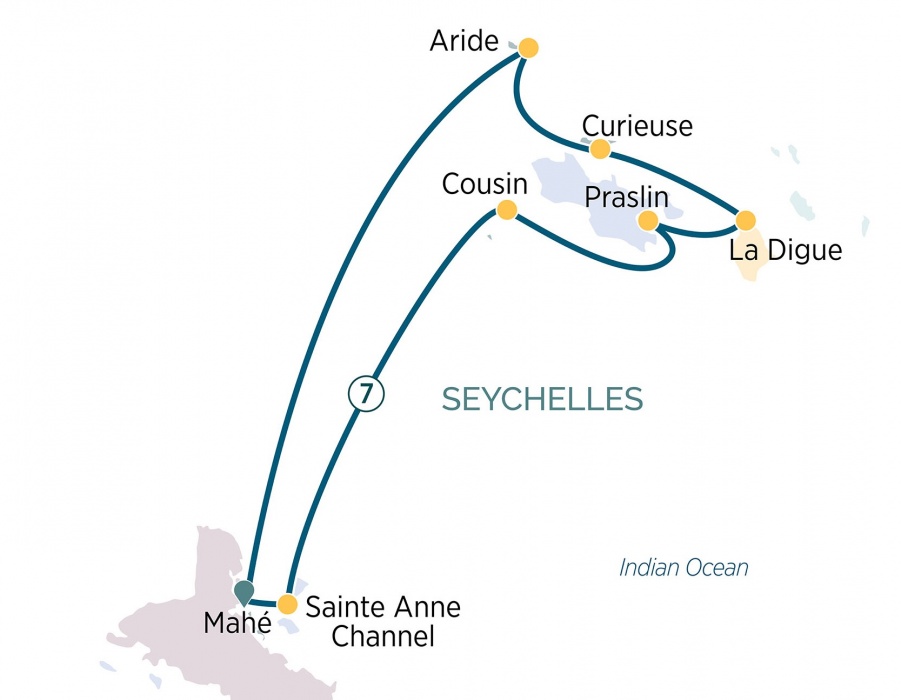 Маршрут круиза: остров Маэ - остров Кузен - остров Праслин - остров Кюрьёз - остров Ариде - остров Маэ.