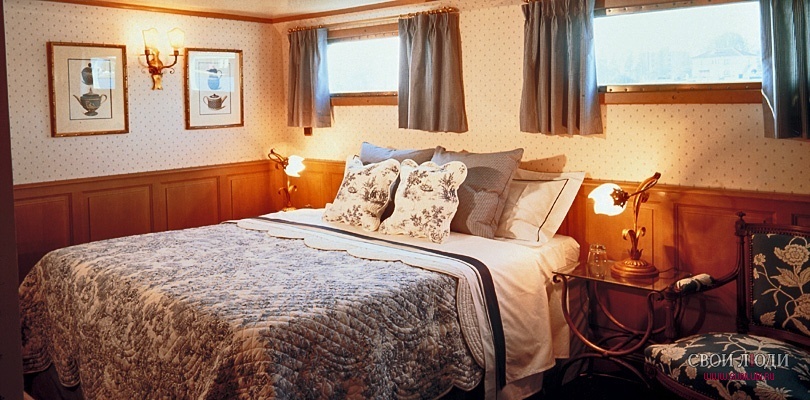Баржа вмещает до 8 человек, имеет 4 большие спальни, в каждой из которых есть кровать King или Twin с покрывалами, украшенными ручной вышивкой. Ванные комнаты находятся внутри каждой каюты, в двух комнатах располагаются просторные душевые кабины, в двух – мраморные ванны с двойными раковинами.