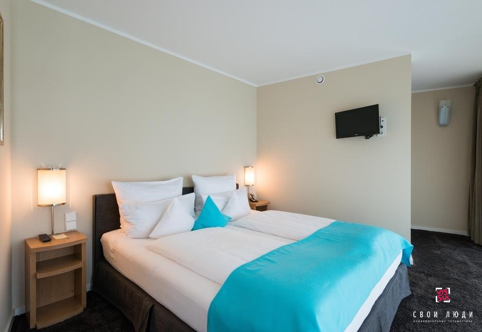 В номере: шумозащитные окна, ванная комната с ванной или душем, фен, косметическое зеркало, письменный стол, телефон, ТВ, радио, беспроводной интернет 3 евро/час, сейф, мини-бар, зеркало во весь рост, халат, уголок для отдыха, кондиционер.
