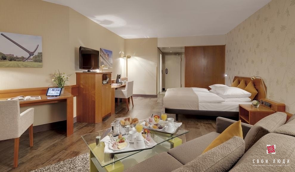 Недалеко от отеля остановки всех маршрутов общественного транспорта Здание отеля выдержано в светло-бежевых тонах. Огромная галерея является также входом в Курфуерстен гелери" – один из самых известных и посещаемых магазинов Касселя. Лобби отеля очень изящно, полы выложены темными плитками, а за круглыми столами могут свободно разместиться посетители.