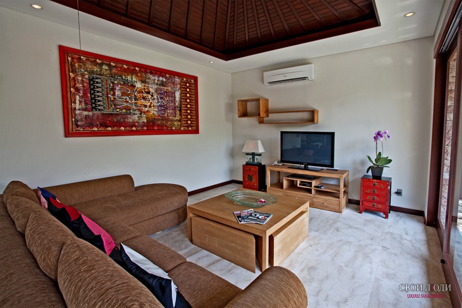 Гости виллы могут приятно провести досуг рядом с бассейном (9х3) в окружении тропического сада. Вблизи - деревянная комфортная терраса с мягкими шезлонгами и кроватями из ротанга, садовая мебель. Здесь можно проводить замечательные романтические вечера под звездами.