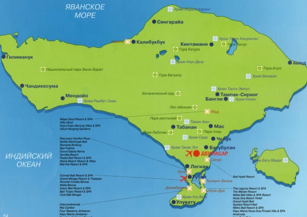 Кстати, остров Бали на карте отмечен зоной повышенной вулканической активности. На его территории расположены два активных вулкана Гунунг-Агунг и Гунунг-Батур. Чтобы полюбоваться их величием, вам необходимо отправиться в северо-восточную часть острова. Весь Бали на карте мира разделен на 6 областей.
