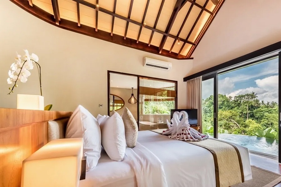 Tanadewa Suite - 70 м2. Люкс двумя спальнями, кровать "king-size" в главной спальне и две односпальные кровати во второй спальне, просторная гостиная, телевизор со светодиодной подсветкой, роскошное джакузи, эспрессо-машина и потрясающий вид на Убуд. Количество гостей: 4 взрослых, 2 взрослых и 2 детей.