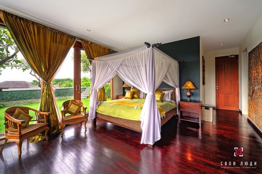 Шикарная вилла на Бали радует своих отдыхающих великолепным панорамным видом и возможностью приятно отдохнуть в ее стенах. Гости могут провести тихий вечер в большой беседке, которая окружена чудным прудом с черепахами и декоративными рыбками. Можно насладиться солнечными лучами в шезлонгах с зонтиками на террасе у переливного бассейна, площадь которого 15х3 м. Уютно и в просторной гостиной с панорамными раздвижными дверями. Замечательная лужайка, вид на окружающие красоты способствуют душевному отдыху и моральной разрядке.