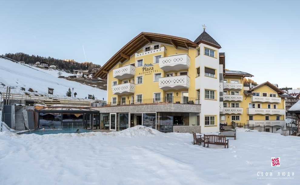 Интерьеры помещений оформлены в традиционном горном стиле с использованием дерева, а из окон открывается очаровательный вид на заснеженные вершины гор. Во всем здании царит уют и спокойствие, здесь можно остановиться с детьми или приехать на уединенный отдых вдвоем и провести романтический отпуск. В отеле есть замечательный оздоровительный центр с бассейнами и изысканный ресторан итальянской и южно-тирольской кухни.