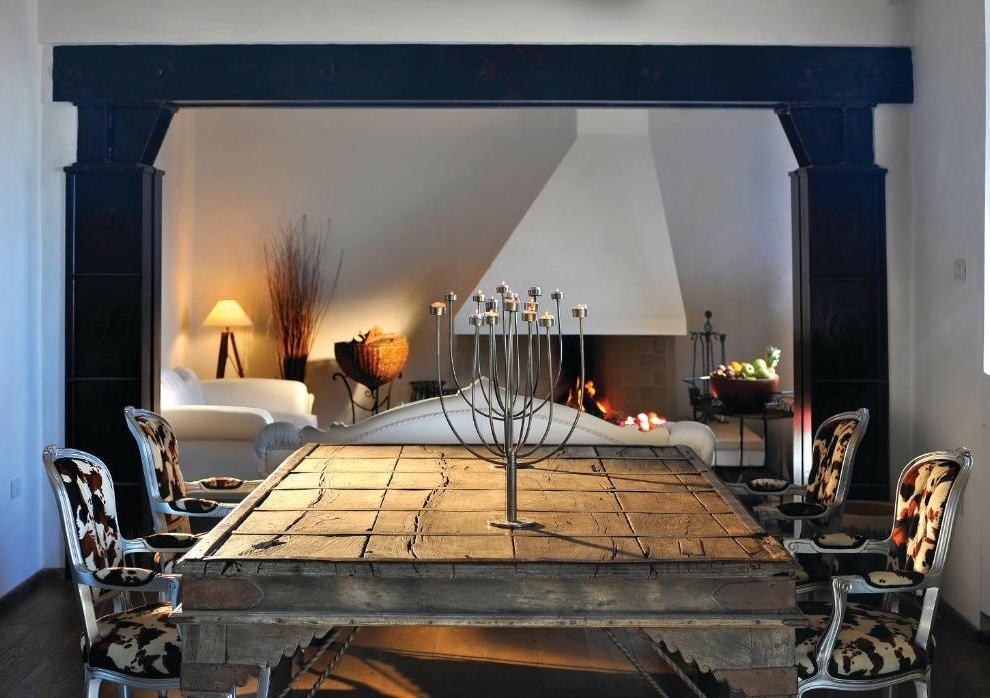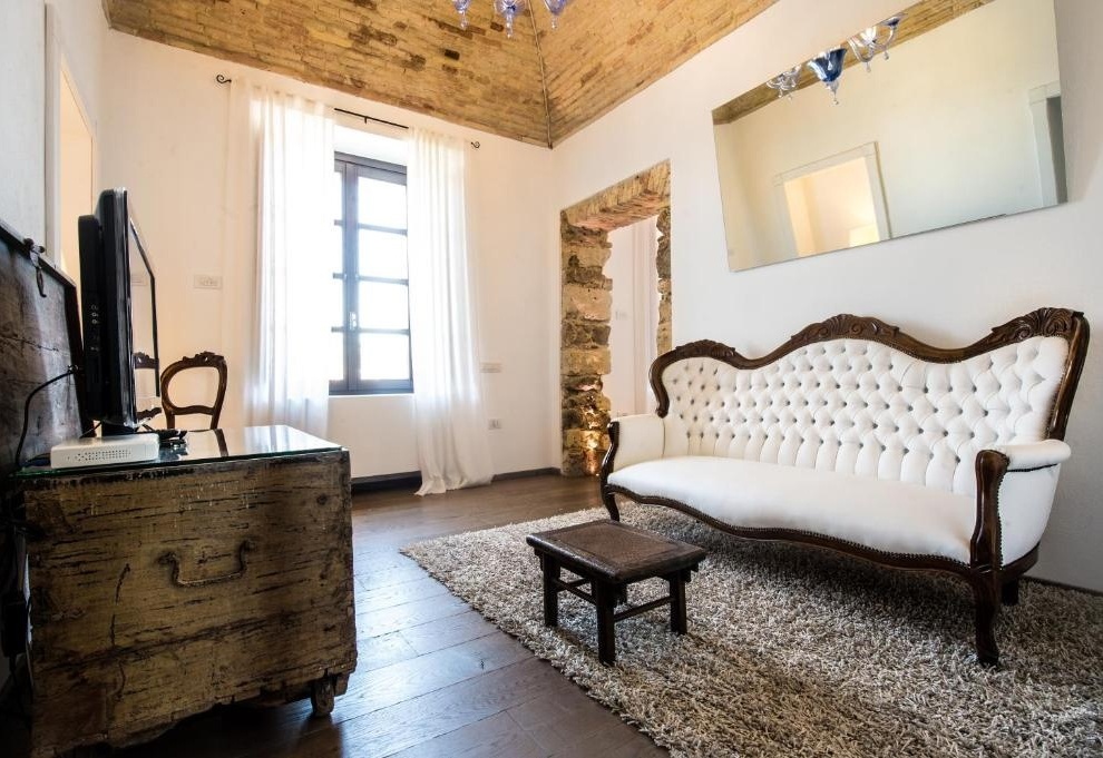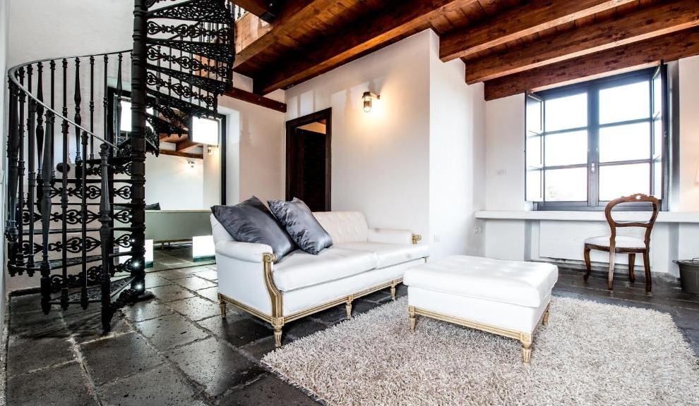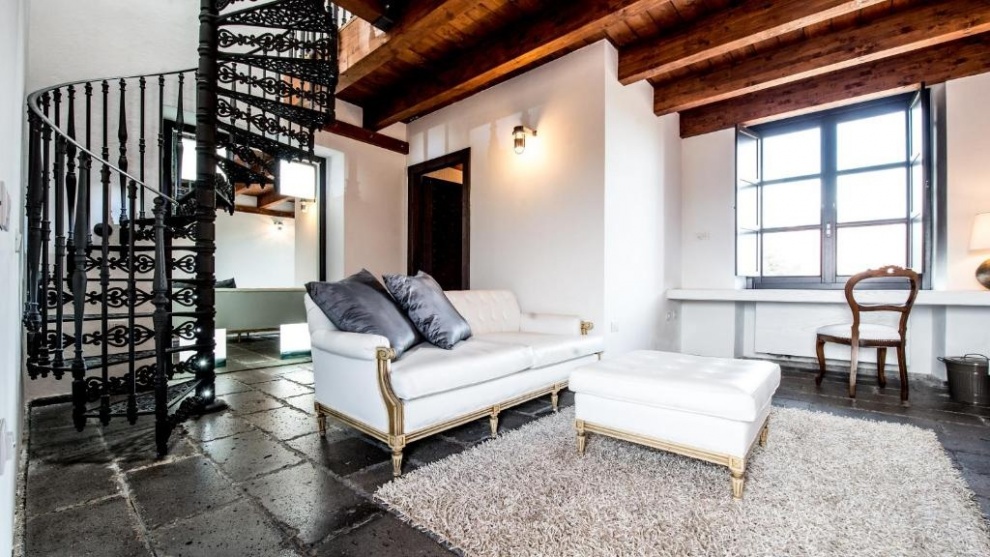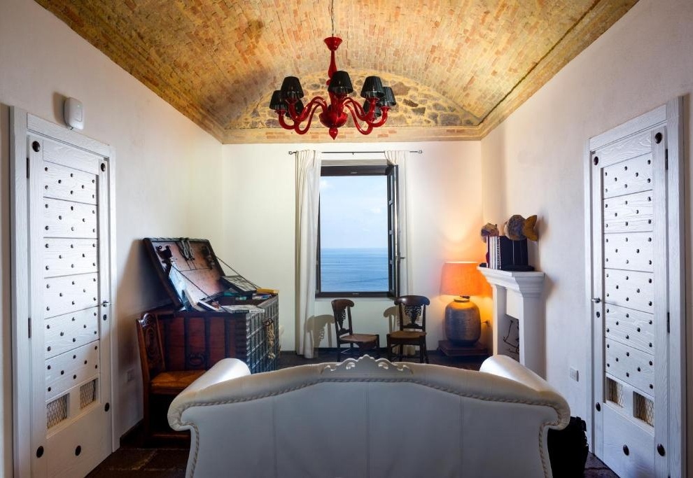 Просторная гостиная общей площадью 120 м2 украшена эксклюзивными люстрами из муранского стекла. Эта комната визуально разделена на элегантный обеденный и уютные гостиные залы. В столовой стоит дорогой старинный стол на 6 персон, а также 4 оригинальных круглых стола. Если спуститься вниз по лестнице, то можно попасть в винный подвал, который когда-то служил резервуаром для хранения пресной воды. Поднявшись по каменной винтовой лестнице на второй этаж, вы увидите чайный зал с библиотекой, роль которой играет гигантский старый сундук и великолепным камином.