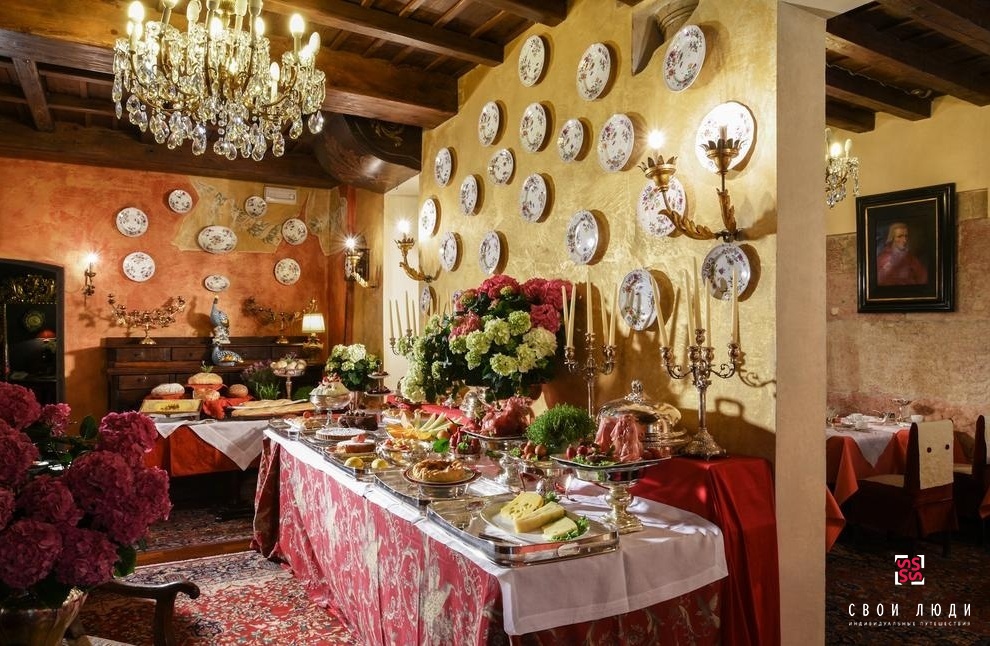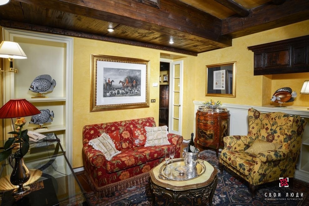 Интерьеры отеля украшают деревянные потолки, фрески и ценные полотна живописи, а в номерах царит романтическая атмосфера, созданная с помощью старинной мебели, восточных ковров, богатых аксессуаров, прекрасных тканей и кружев.