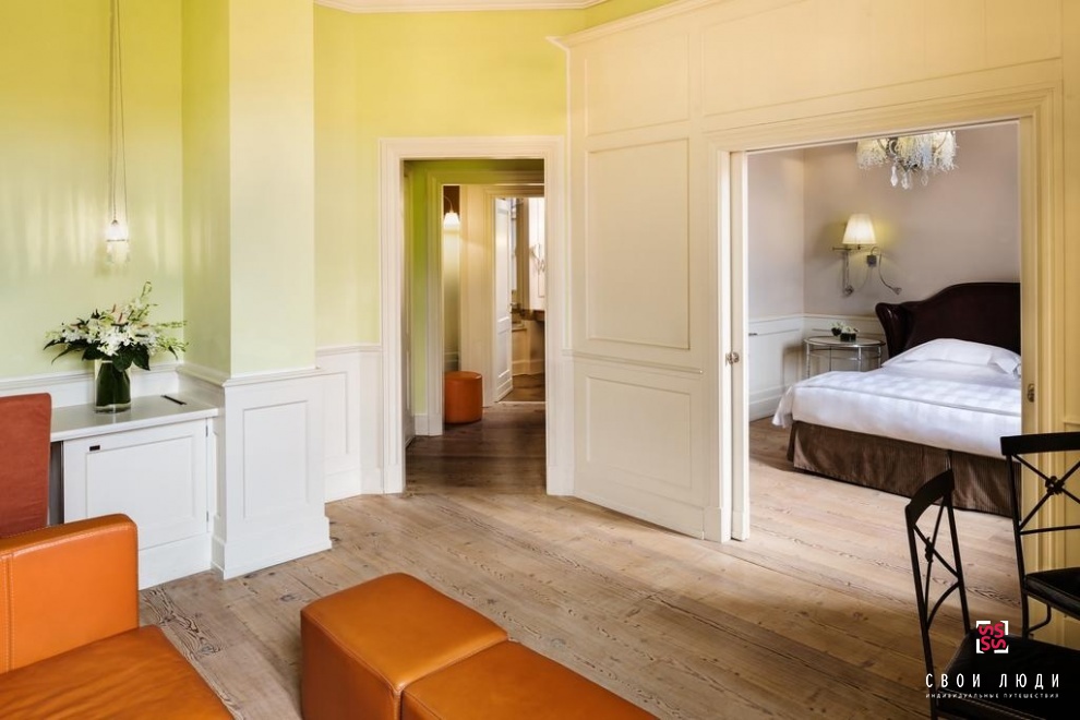 Suites: от 45 до 50 метров, состоят из двух отдельных комнат и небольшого кабинета с письменным столом, декорированы деревянными панелями, креслами и диванами с дорогой обивкой.