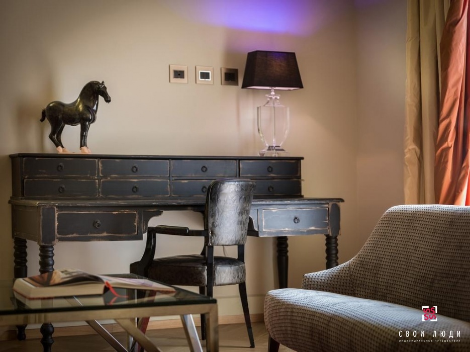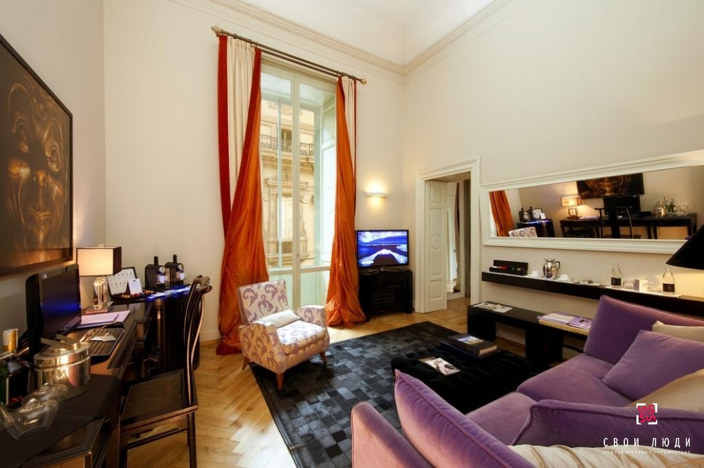 Самый маленький номер отеля, площадь которого составляет 36 кв.м. – Vivaldi Junior Suite. Это очаровательный двухуровневый номер с необычными потолкам. В спальной стоит большая кровать king-size, в ванной комнате – хромотерапевтический душ и ванная. На верхнем уровне оборудована рабочая зона. В номере есть два телевизора, беспроводные телефоны и международные линии, компьютер-ноутбук, беспроводной Интернет, большой сейф. Каждый номер обслуживает персональный дворецкий.