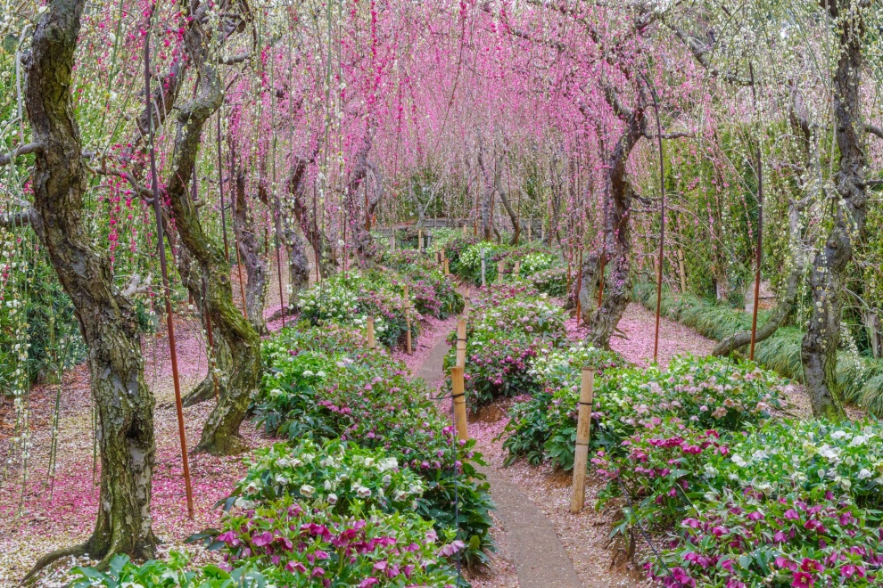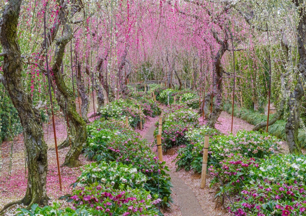 С февраля по март посетители могут увидеть яркие цветущие сливы, которые сменяются тюльпанами и сакурой в апреле. Вишнёвые деревья Ёсино и махровая сакура покрывают парк нежным розовым цветом, а вечернее освещение делает эту картину ещё более романтичной.