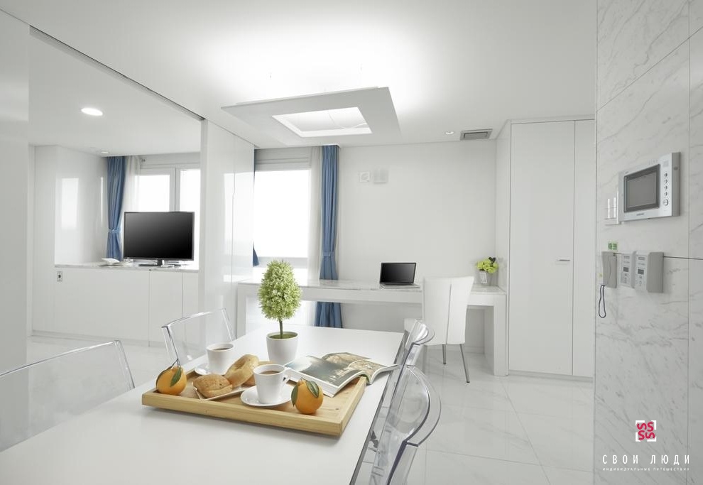 Family Suite: просторные и комфортабельные сьюты площадью 102 кв. м. выполнены в традиционном корейском стиле с использованием ярких деталей. Номера состоят из спальни, гостиной и кухонной зоны и ванной комнаты.