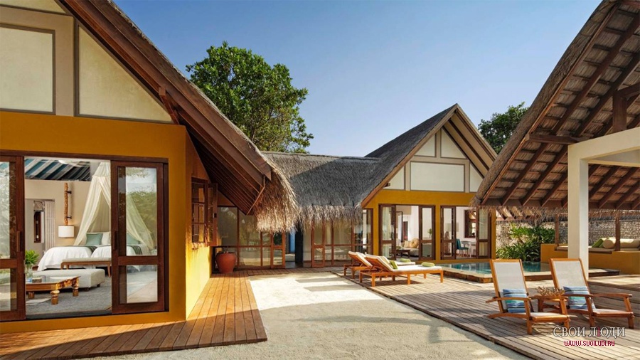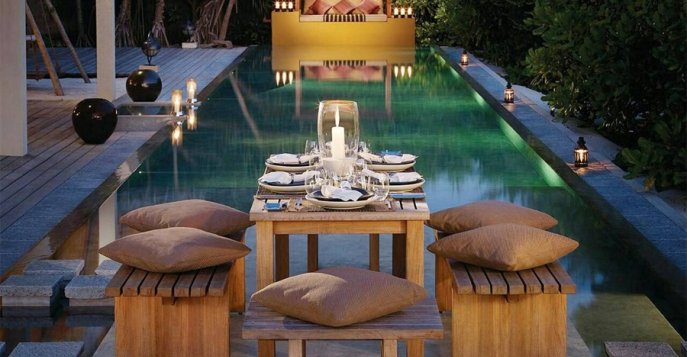 Two-Bedroom Royal Beach Villa: вилла с великолепным видом на лагуну (западная часть острова). Состоит из двух спален (одна с кроватью «king-size», другая – с двумя односпальными кроватями), открытого павильона с гостиной и столовой зоной, обеденной зоны над бассейном, кухни, трех ванных комнат, двух душей в саду, бассейна (20 кв. м) и большого частного сада. Площадь виллы – 310 кв. м.