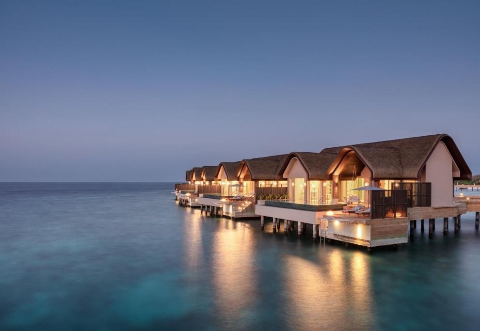 Вилла Sunset Grand Ocean Pool (95 кв. м) включает в себя террасу с личным открытым бассейном площадью 33 кв. м, спальню с гостиной зоной, гардеробную, ванную комнату и тропический душ под открытым небом. Он предлагает вид на закат и расположен на сваях над водой.