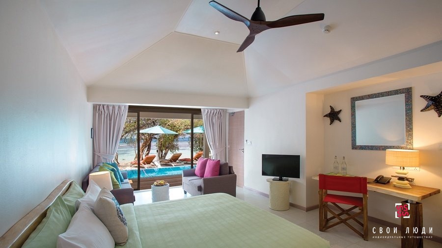 2 Bedroom Beach Pool Suite: 2 виллы площадью 191 м2. Каждая вилла состоит из основной спальни с двуспальной кроватью и дополнительной спальни с двумя односпальными кровати, ванной комнаты, просторной террасы и собственного бассейна площадью 20 м2, оборудованного лежаками.