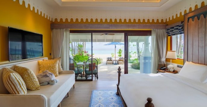 4 Beach villa 2-bedroom - это просторные высококлассные виллы с двумя спальнями с крытым лаунджем для отдыха, стильной мебелью, выполненной на заказ, и широкими частными террасами с прямым выходом на пляж и потрясающим видом на море. Удобные кровати обеспечивают глубокий, спокойный сон, а две просторные ванные комнаты с раковинами и водопадным душем, а также ванна и душ на открытом воздухе дарят бесконечный комфорт. Площадь виллы 120 кв. м.