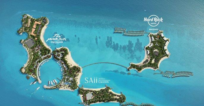 В 2019 году на Мальдивах появились не просто два новых отеля, начал свою работу первый на этих островах уникальный курортный комплекс Crossroads Maldives. Он состоит из трех искусственных островов, между которыми выстроены пешеходные мосты. Два острова отведены под отели Hard Rock Hotel Maldives 5* и SAii Lagoon Maldives 5*, а третий - The Marina – целый мир развлечений на открытом воздухе в 11000 квадратных метров, где есть площади и террасы для прогулок, сувенирные магазины и модные бутики, спа-центр и даже музей. А еще на острове развлечений работают Центр Морских Исследований со множеством водных видов спорта, детский клуб и лагерь, залы для мероприятий и огромный выбор ресторанов и магазинов, в том числе такие как Hard Rock Café и Café Del Mar.