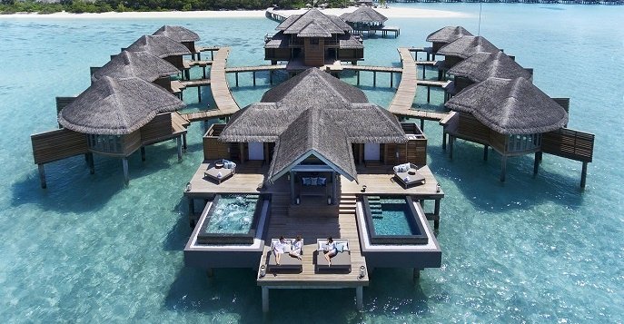 Four-bedroom over water pool residence (917 кв. м) двухэтажная вилла на сваях над водой. Терраса с открытым персональным бассейном (55 кв. м) и спуском в воду, гостиная, столовая, 4 спальни (две – с кроватями king-size, две – с двумя отдельными кроватями), ванные комнаты. Услуги персонального камердинера.