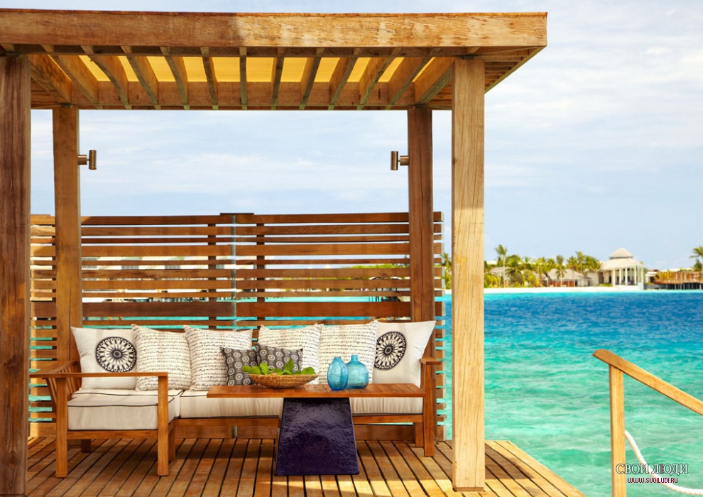 Water Villa: 218 кв.м, построена на сваях в лагуне и располагает спальней, гостиной, ванной комнатой и террасой с бассейном и спуском в воду.