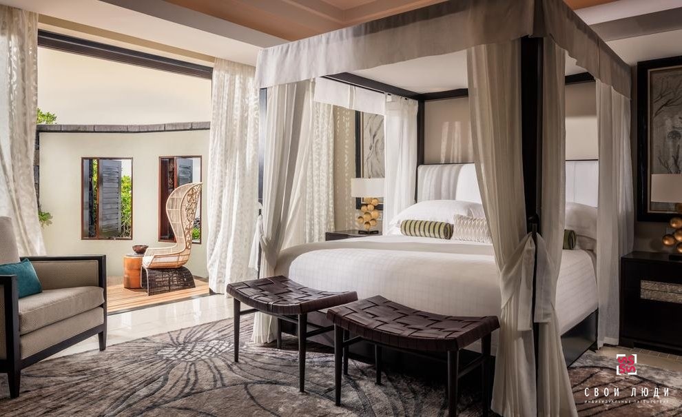Во всех номерах: телефон с прямым дозвоном, подключение к Интернету и Wi-Fi в номере (за дополнительную плату), сейф, кондиционер, мини-бар, TV со спутниковыми каналами и LCD-экраном, DVD/CD-приставка, док-станция для подключения iPod, принадлежности для приготовления чая и кофе, фен, халаты и тапочки. В спальне кровать King size или две кровати Twin. В ванной комнате отдельно просторная гардеробная, душ, ванная и туалет, тропический душ в приватном садике. Доставка блюд и напитков в номер 24 часа.