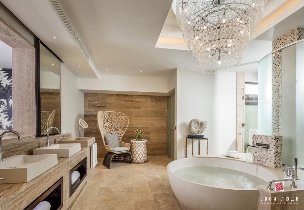 1 Presidential Two Bedroom Suite (375 м2, а также веранда, бассейн 50 м2 и приватная территория в саду). Этот сьют представляет собой отдельную виллу, расположенную на приватном острове Ile aux Chats, на самом привилегированном его участке, с панорамным видом на лагуну и океан. Вилла имеет две роскошные спальни - главную с одной супружеской кроватью и гостевую с двумя кроватями Twin - каждая с собственной ванной комнатой. Главная ванная комната с видом на океан оснащена парилкой и великолепной ванной-джакузи из цельного монолита черного мрамора. Уютная гостиная, столовая, кухня, оснащенная по последнему слову техники, рабочий офис с компьютером, гардеробная и просторная меблированная веранда. В приватном саду для удобства гостей есть затененное патио, удобное для трапез на свежем воздухе, и большой бассейн. Вилла отличается роскошным убранством, прекрасным вкусом и предлагает тот уровень приватности, который позволяет провести семейные каникулы в полном уединении. Можно поставить одну дополнительную кровать.