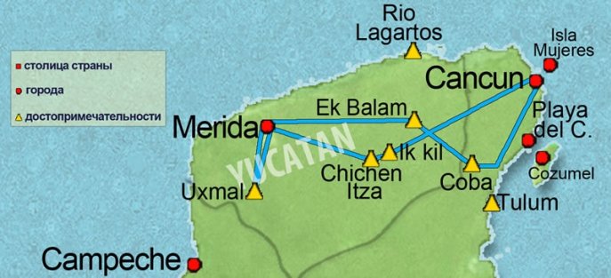 Маршрут тура: Канкун —Тулум — Бакалар — Шпухиль — Калакмуль — Паленке — Залив — Камепче — Ушмаль — Мерида — Чичен Итца — Иккль — Канкун/Ривьера Майя.