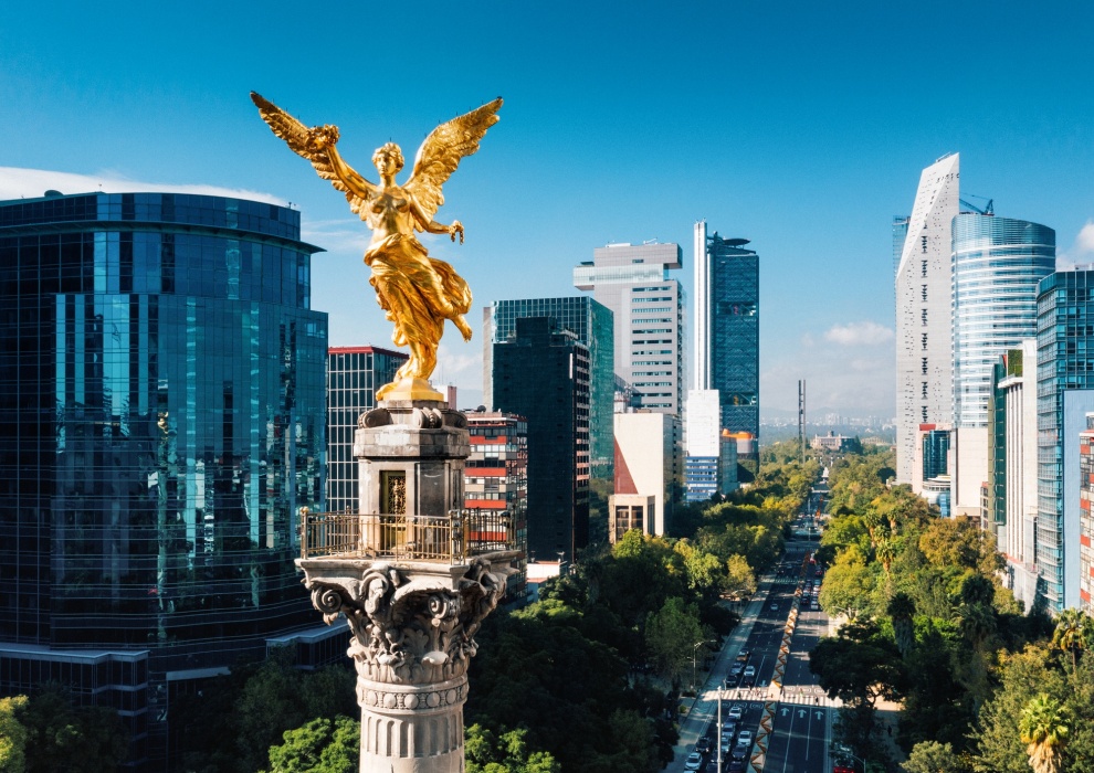 Далее маршрут проходит по знаменитому проспекту Пасео-де-ла-Реформа, украшенному памятниками героев страны, элегантными фонтанами и современными небоскрёбами.