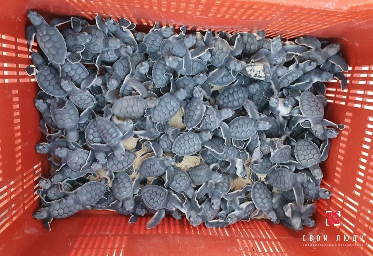 Трогать черепашек не рекомендуется, потому что первым их "впечатлением" в жизни должен быть песок этого пляжа, чтобы через много лет, они могли сюда вернуться и оставить новую жизнь.