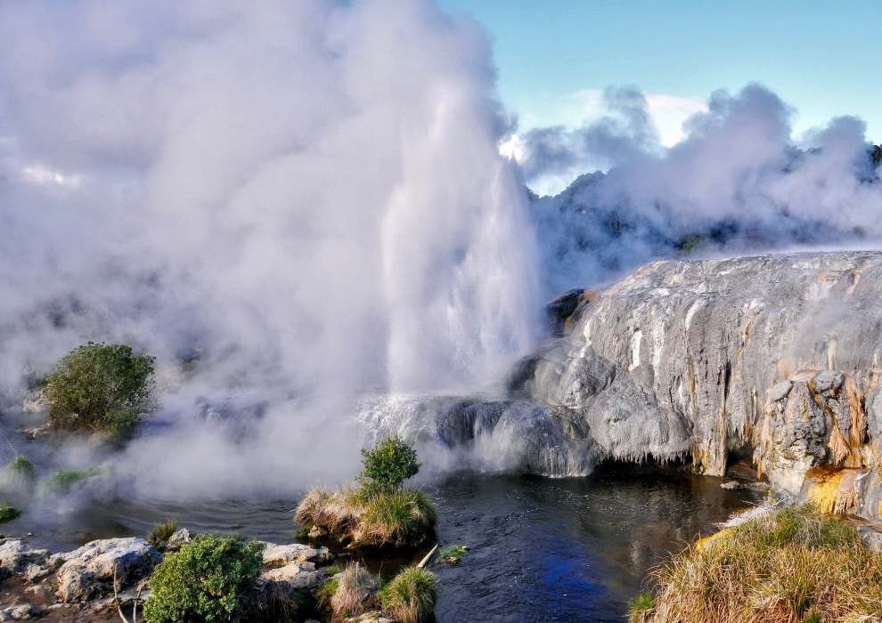 Приезд в обязательное к посещению место – долину гейзеров Роторуа. На ее территории находится крупнейший в стране гейзер – Похуту. Примерно каждые 20 минут он выбрасывает фонтан горячей воды на высоту в 30 метров. За извержением можно наблюдать в течение часа, а иногда и дольше.