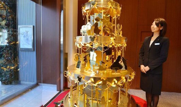 На этот раз специально к зимним праздникам и 110-летнему юбилею студии Уолта Диснея японцы создали настоящую золотую ель. Она весит около 40 кг и украшена фигурками диснеевских героев, а её стоимость превышает 4 240 млн. долларов. Новогоднее дерево-2013 в Японии получилось меньше по высоте прошлогоднего экземпляра, однако стоит оно в два раза дороже, а весит – в три раза больше.
