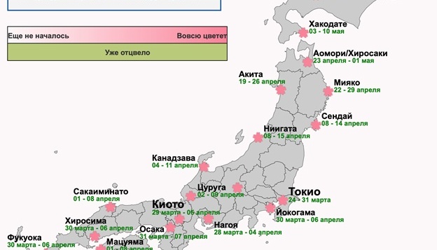Когда приходит время, сакура зацветает повсюду в Японии. Каждый год японская метеорологическая корпорация публикует прогнозы до и во время всего периода цветения сезона.