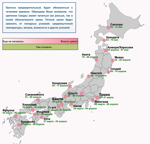 Самые первые лепестки ожидаются в Токио 24 марта, а пик цветения («манкай») придется на 27-31 марта. В это же время предвестники весны распускаются и в Коти, здесь они достигают своего пышного цветения с 27 марта по 3 апреля. Южные регионы, такие как Нагоя, Хиросима, Фукуока и Осака начнут утопать в цветущей сакуре чуть позже, максимального пика достигнут в первой неделе апреля. Для тех, кто хочет насладиться красотой сакуры в конце апреля, стоит обратить внимание на Акиту и Мияко, там теплый климат пробуждает деревья только в 20-х числах месяца.