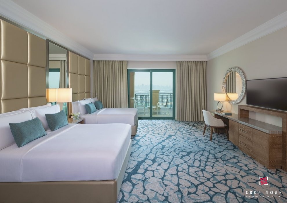 Palm Beach Deluxe: 45-47 кв.м, самые популярные номера в отеле с видом на насыпной остров The Palm и линию горизонта Дубая. Могут быть оборудованы кроватью king- или двумя кроватями queen-size, рассчитаны на размещение 2 взрослых + 2 детей младше 12 лет или 3 взрослых + 2 ребёнка младше 12 лет. В номере есть просторный балкон (в спальнях с двумя кроватями – французский), ванная комната с душевой кабиной и отдельной ванной.