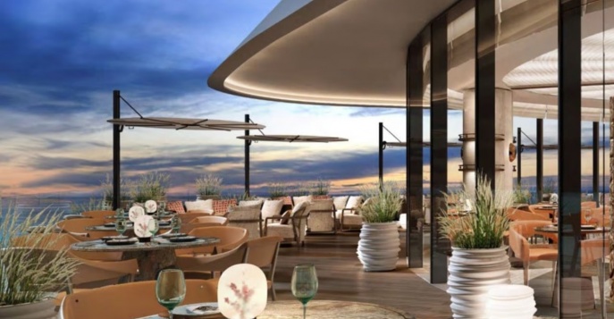 Promenade Terrace Suite: 174 м2, терраса с видом на пристань для суперяхт, гостиная, двуспальная кровать и один раскладной двуспальный диван-кровать. Количество гостей: 2 взрослых и 2 детей (младше 12 лет) или 3 взрослых.