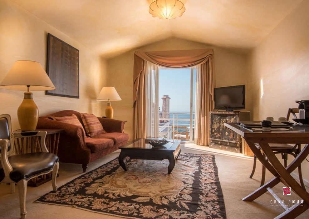 Белое крыло - новое здание отеля, открыто летом 2005 г. Выстроено в форме берегового шале и прекрасно вписывается в исторический интерьер комплекса. На верхних этажах здания расположены двухэтажные номер с панорамным видом на побережье. - 1 suite sea view, - 5 rooms sea view.