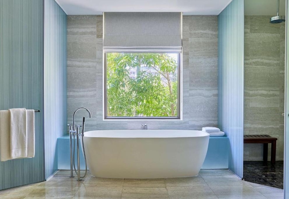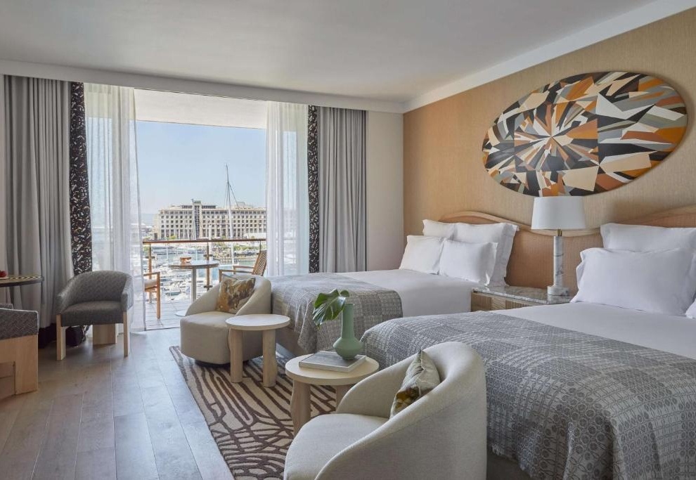 Marina Rise Rooms: большие номера с балконом и панорамными окнами. Современный интерьер, зона отдыха, просторная ванная с отдельно стоящей ванной и душем.