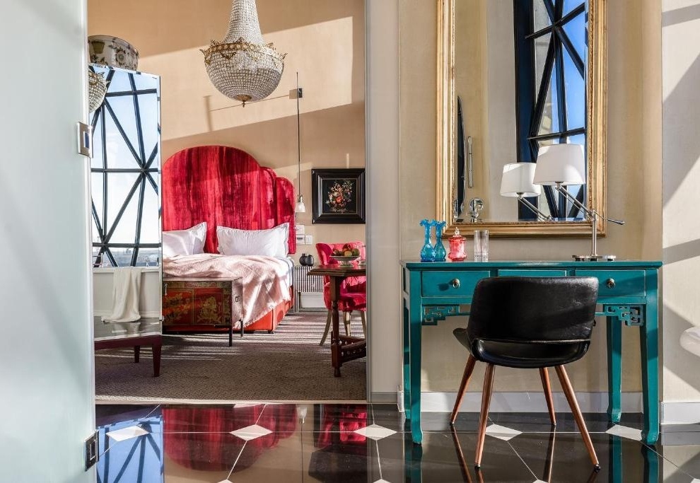 Penthouse: флагман отеля — огромный сьют с панорамными стеклянными стенами, приватной террасой и уникальной коллекцией искусства.
