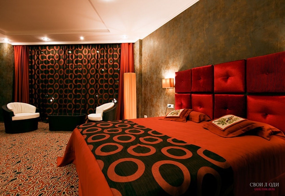 Design Deluxe Свадебный: эксклюзивный дизайнерский полулюкс с первого взгляда покоряет роскошью и изяществом, настраивает на романтику. Он выполнен в тонах горького шоколада и молочной ванили, восхищает изысканными элементами декора (например, зеркалами в виде сердец и стилизованным балдахином над кроватью).