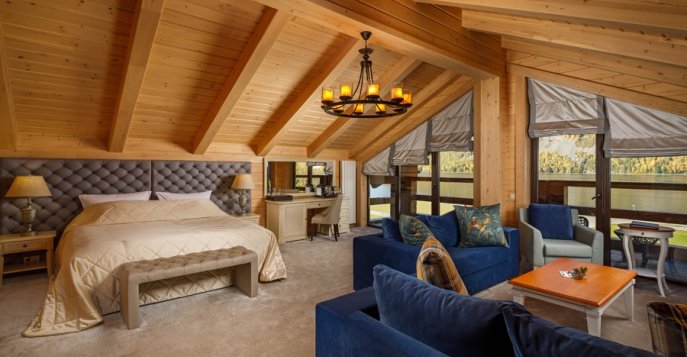 Royal chalet - роскошное двухэтажное шале из массива кедра площадью 180 кв.м. с тремя спальнями и просторной террасой. Уютная гостиная с отдельной обеденной зоной, мягким диваном и креслами. В шале: кровати king size, по 2 ванные комнаты на каждом этаже, чайная станция, кофейная станция, мини-бар, TV, сейф, увлажнитель воздуха, гладильная станция, большая терраса 25 кв.м. с шезлонгами и 2 балкона, авторские картины.