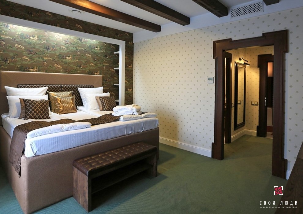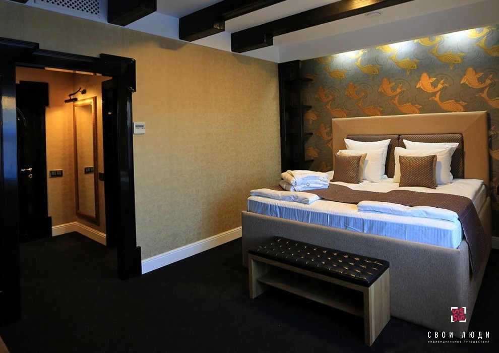 В отеле всего 11 номеров, но много общественного пространства – 200 кв. метров на каждый номер. Все номера одной площади (27 кв.м.) и одинаковой планировки. Пять номеров имеют выходы к бассейну и реке. В отеле имеется каминная комната. Ее оформление - зелёный мрамор и изразцы, золотая медь и белый кирпич с граффити. Из панорамного окна открываются виды на реку, заливной луг и роскошные закаты. Это идеальное место для отдыха и задушевной беседы.