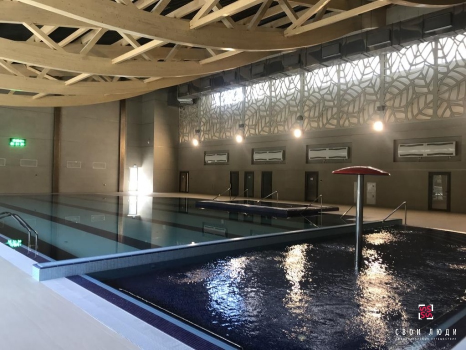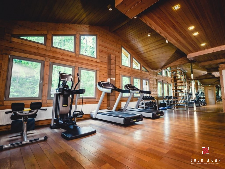 Внутренняя отделка и дизайн комплекса также заслуживают отдельного внимания. Благодаря большим панорамным окнам здесь создается ощущение полного единения с окружающей природой — будто вы и не в здании вовсе, а среди изумрудных деревьев, что видны за окном. Этот эффект особенно ощутим в крытом 25-метров бассейне с детской зоной и зоной джакузи. Здесь выход на террасу позволяет в теплое время года наслаждаться ароматом леса, греясь на солнце.