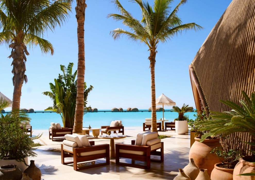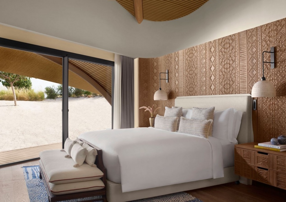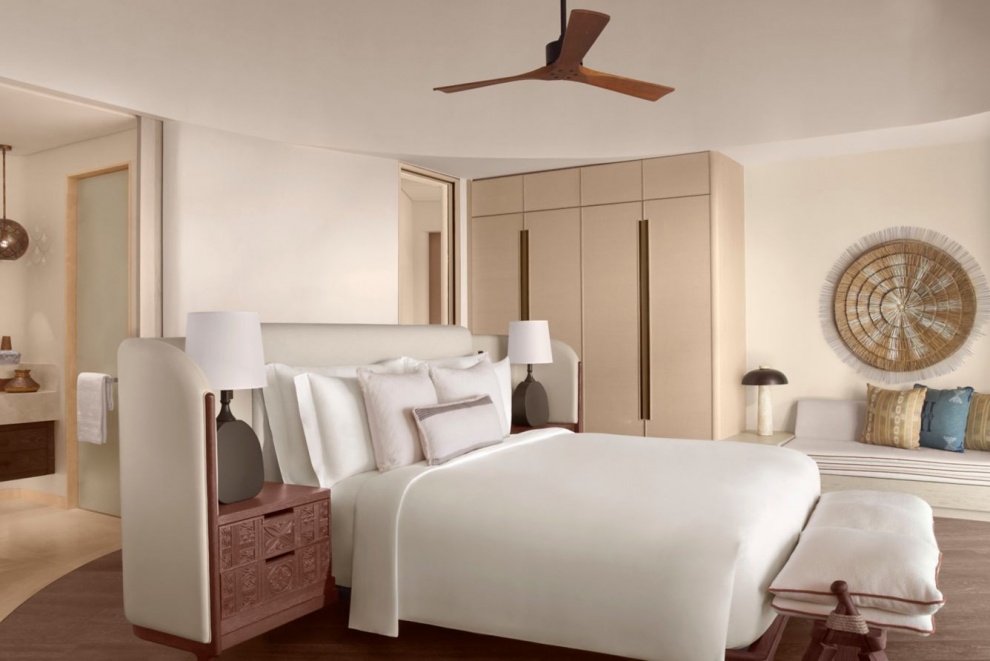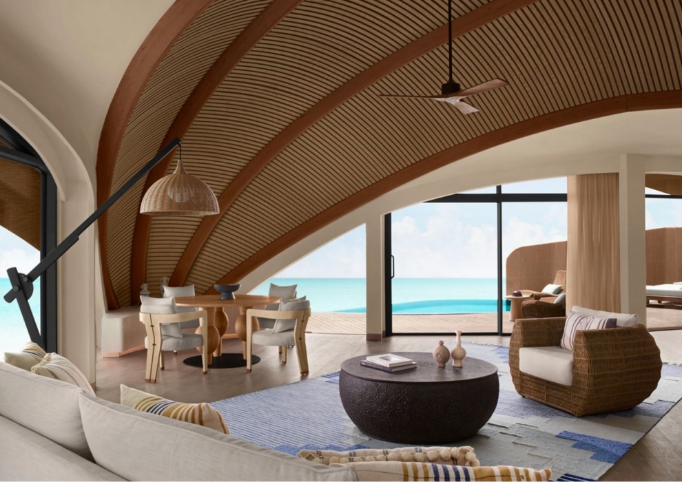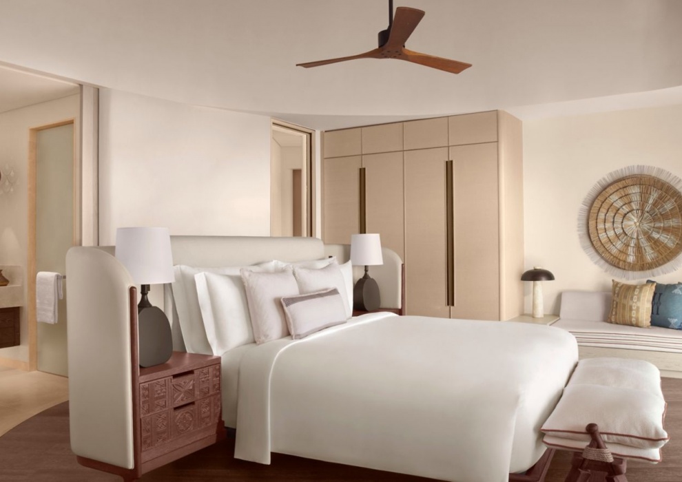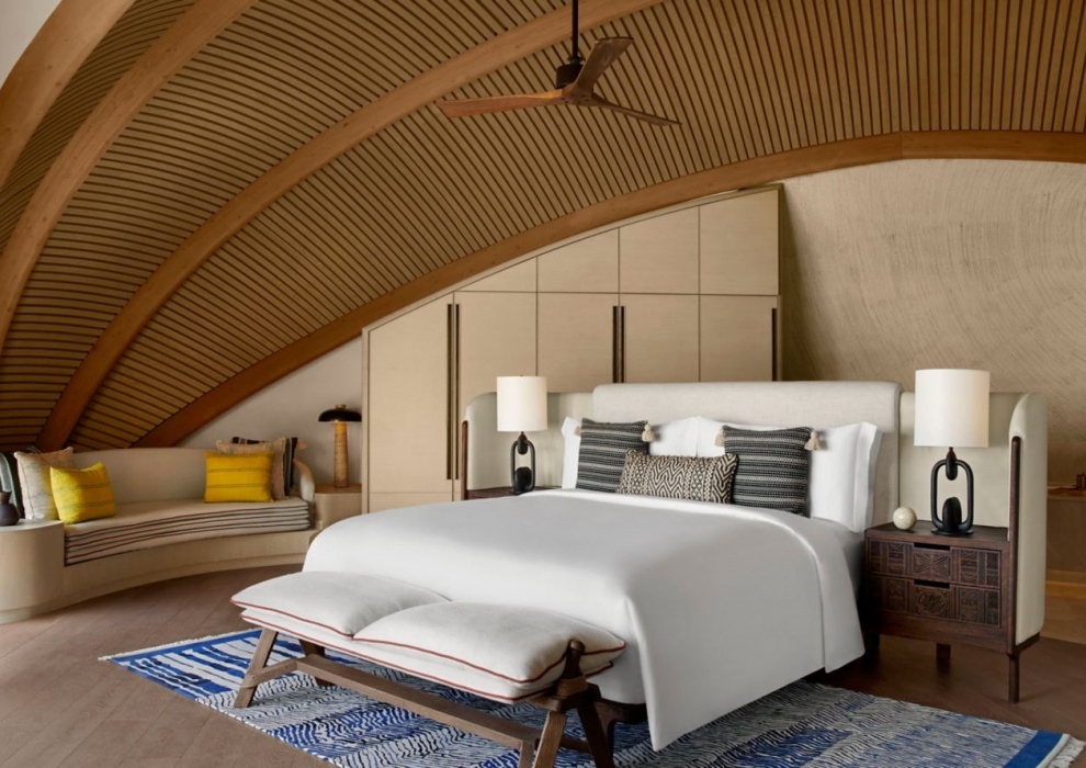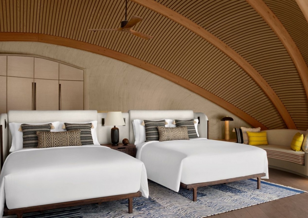 Royal Nujuma Villa 3-Bedroom - 359 м2. Терраса с открытым персональным бассейном, гостиная с обеденной зоной, мини-кухня, кабинет, 3 спальни (две - с кроватью king-size, одна - с двумя кроватями queen-size), гардеробная, комната для персонала, 3 ванные комнаты. Кондиционер, спутниковое телевидение, телефон, Wi-Fi доступ в интернет, утюг и гладильная доска, оборудование для приготовления чая и кофе, холодильник, плита, посудомоечная машина, сейф, фен, халаты, тапочки, телескоп. Вид на море. Варианты размещения: 6 человек.