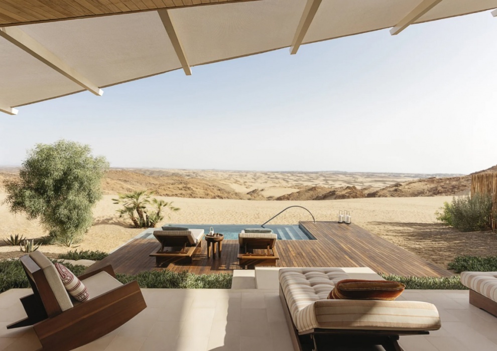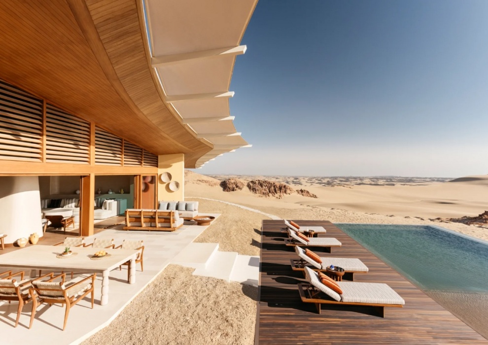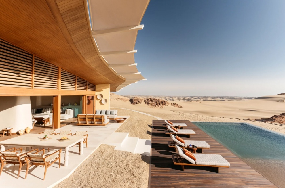 The Sunset Reserve - 400 м2. Терраса с открытым персональным бассейном, 4 балкона, гостиная с обеденной зоной, 4 спальни (две - с кроватью king-size, две - с двумя отдельными кроватями), гардеробная, 4 ванные комнаты (каждая - с ванной и душевой кабиной), душ на открытом воздухе, 2 гостевых туалета. Кондиционер, спутниковое телевидение, Wi-Fi доступ в интернет, мини-бар, сейф, фен, халаты. Вид на пустыню и закат. Варианты размещения: 8 человек.