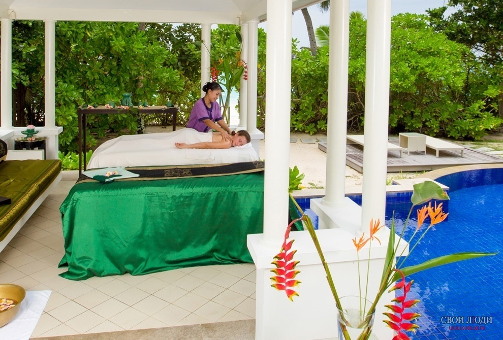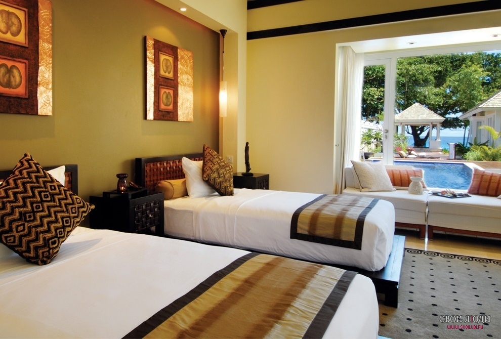 Beachfront Spa Pool Villa (250 кв. м) — расположена у океана, имеет выход к пляжу, состоит из спальни, ванной комнаты, открытого павильона с гостиной и обеденной зонами, массажного павильона, парной, террасы с бассейном (4 х