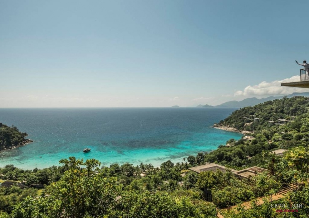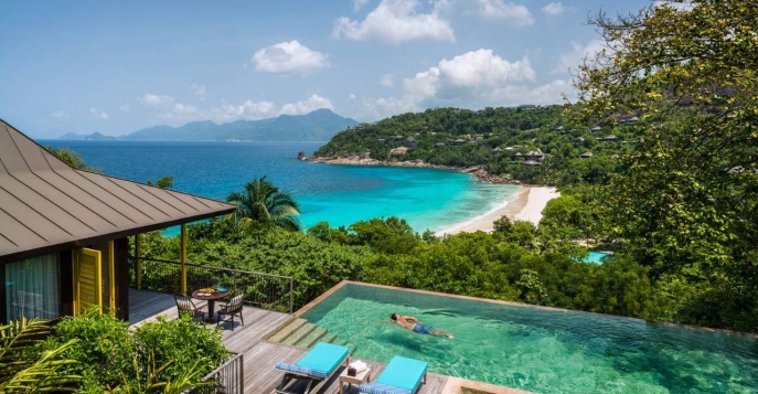 Three-Bedroom Royal Suite: 827 м2. Расположен на склоне холма, в нескольких шагах от береговой полосы. Включает 4 павильона: двухэтажный павильон с гостиной, кабинетом, столовой на 6 человек, хозяйственной зоной c отдельным входом; три павильона со спальнями и ванными комнатами (каждая – с ванной и душем на свежем воздухе); открытую террасу (458 м2) с гостиной зоной, джакузи и бассейном (106 м2); выходит на океан и джунгли острова Маэ. Максимальное размещение – 9 взрослых или 5 взрослых+4 ребенка.