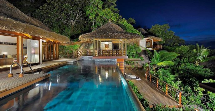 Один из самых роскошных отелей на Сейшельских островах под управлением всемирно известного бренда. Территория отеля потрясающе живописна, виллы расположены на склонах холма, откуда открываются захватывающие виды. Бухта образует уединенный пляж, фактически доступный только для гостей отеля и отлично защищает от сильных волн. А со стороны скал, окружающих бухту, есть отличные места для снорклинга.