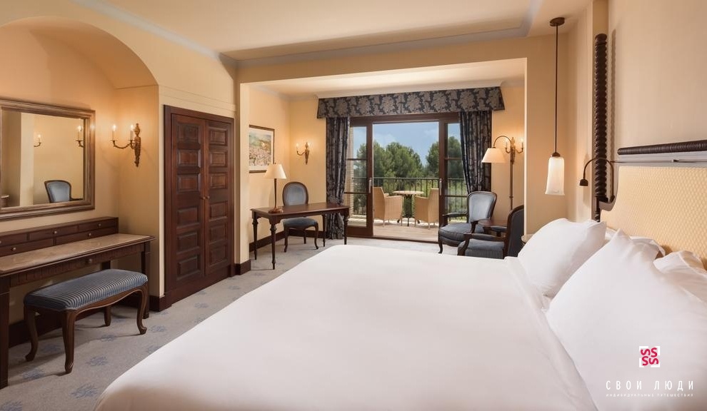 Проживающих ждут роскошные 167 номеров. Все комнаты подверглись тщательной реставрации и имеют классическое оформление. Из окон фасада открывается дух захватывающий вид на ослепительной красоты цветущий сад и парк. Классический средневековый стиль сооружения неплохо гармонирует с дизайнерскими элементами декора, выполненными в голубых и пастельных тонах. В номерах Castillo Hotel Son Vida 5* доступна вся современная техника: платное телевидение, спутниковые каналы, плеер DVD, кондиционер, сейф, интернет-точка, мини-бар. Класс апартаментов deluxe вмещает дополнительную гостиную и оформлен в традиционном стиле – темно-красные или насыщенные синие цвета интерьера. Окна открывают обзор на поле для гольфа или залив.
