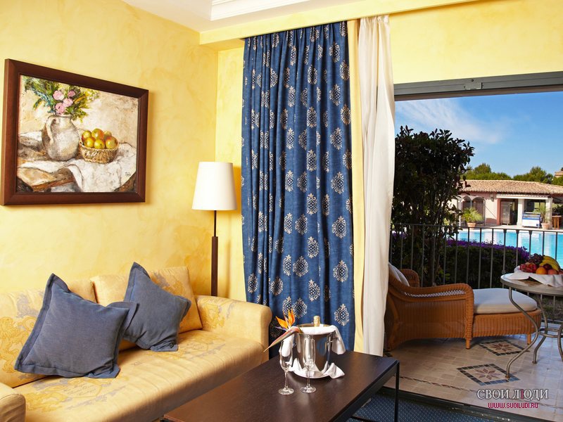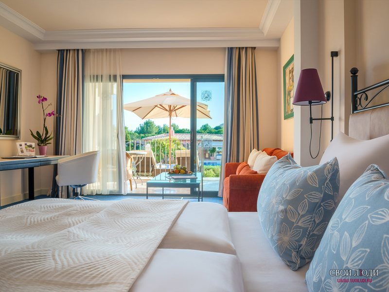 Standard Double Room Tramuntana: номер на втором этаже с видом на поле для гольфа, состоящий из спальни с двуспальной кроватью, гостиной зоны, ванной комнаты с душем и ванной, балкона. Максимальная вместимость – 3 чел. Площадь номера – 45 кв. м.